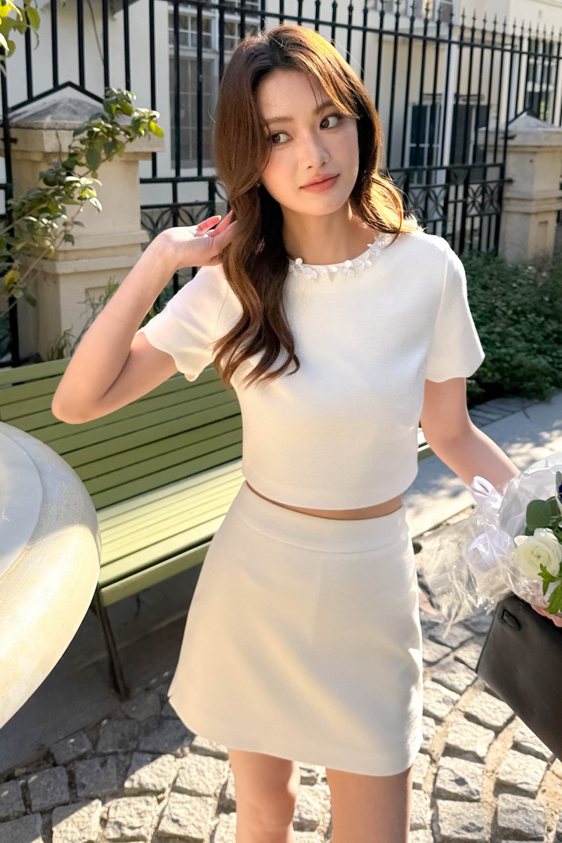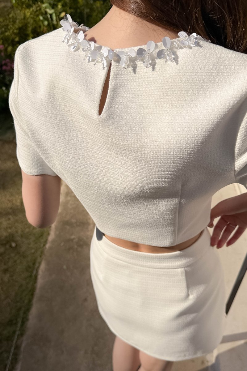LIX TWEED CRYSTAL PETAL TOP IN WHITE